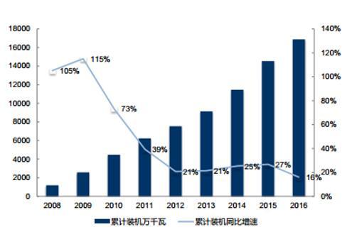 相比之下, 海上風(fēng)電增長增速高于陸上風(fēng)電,成為未來風(fēng)電行業(yè)重要的增量。 事實上,伴隨著陸上風(fēng)電可開發(fā)的區(qū)域逐漸減少,而海上風(fēng)電資源豐富,且沿海地區(qū)經(jīng)濟(jì)發(fā)達(dá),電網(wǎng)容量更大,風(fēng)電接入條件更好,近年來風(fēng)電行業(yè)逐漸由陸上向近海發(fā)展。 2001 年-2015年全球海上風(fēng)電累計裝機容量復(fù)合增長率 43.51%,2015年累計裝機容量 12167MW。2016 年全球海上風(fēng)電市場新增裝機容量 2217MW,同比下滑 36%。 截止 2016 年底,全球海上風(fēng)電累計裝機容量達(dá)到 14384MW。