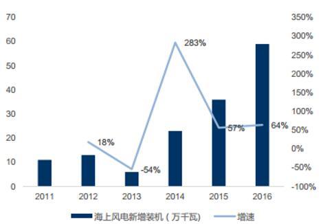 值得注意的是,與陸上風(fēng)電裝機下行相反,2016 年中國的海上風(fēng)電裝機則增長了六成。2016 中國海上風(fēng)電新增裝機 154 臺,容量達(dá)到 59 萬千瓦,同比增長 64%。