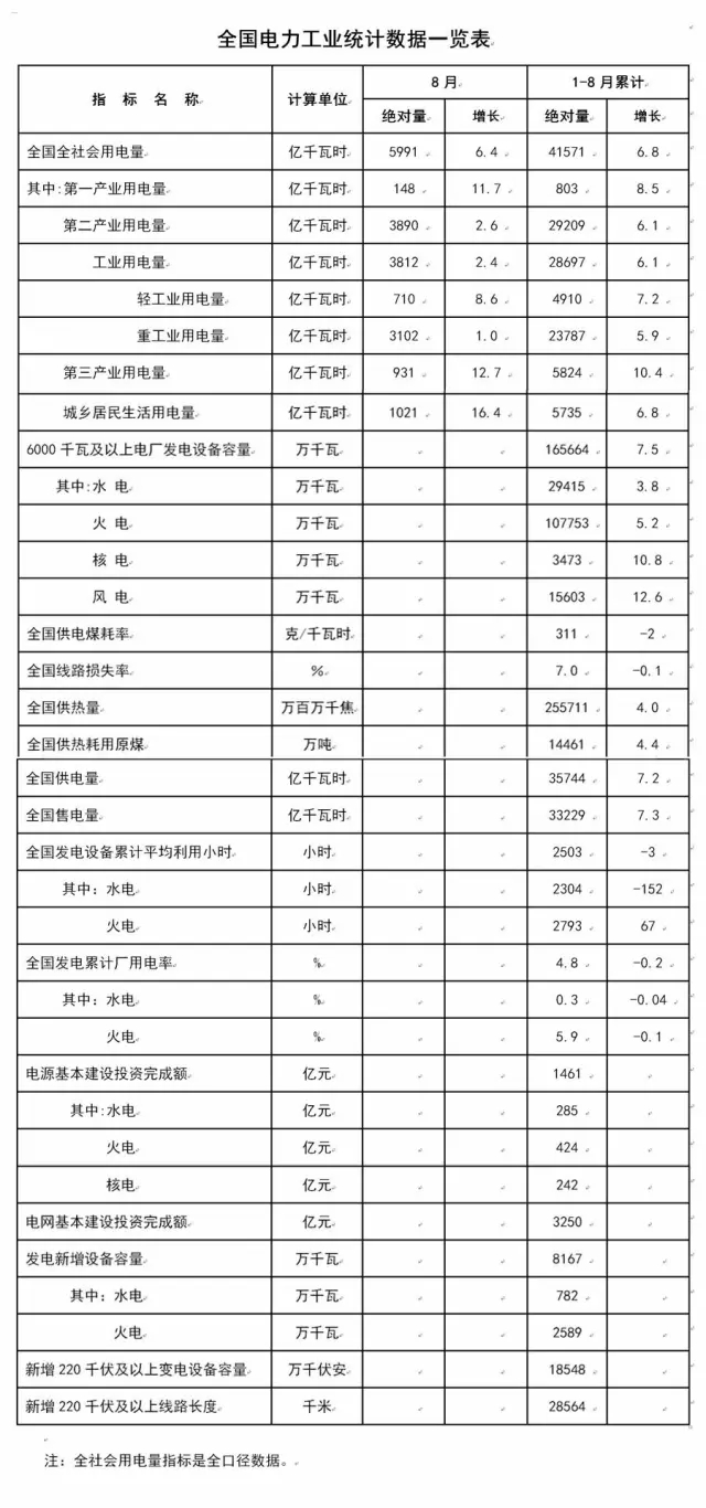 9月21日,國家能源局發(fā)布1-8月份全國電力工業(yè)統(tǒng)計數(shù)據(jù)。