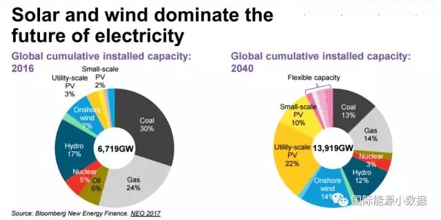 中國儲能網訊:根據彭博新能源財經(BNEF)的數據,2016年全球電力裝機6719吉瓦,其中煤電占比30%,其次是天然氣發(fā)電(24%)、水電(17%)、陸上風電(7%)、燃油(6%)、光伏(5%)、核電(5%)??梢姡?016年化石能源發(fā)電容量占比達到60%.
