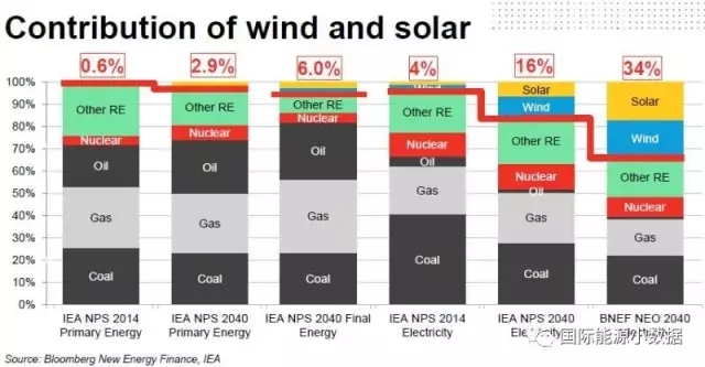 然而,其他機構的預測要大大低于BNEF的預測。比如國際能源署(IEA)認為2040年的風電光伏占總發(fā)電量的比例約為16%,在一次能源消費中僅占2.9%。