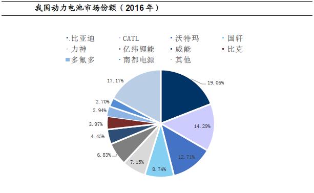 動(dòng)力電池產(chǎn)能主要集中在中日韓三國(guó),行業(yè)巨頭主要包括韓國(guó)的松下、三星、LG化學(xué)以及日本的ASEC、三洋電氣、日本湯淺以及SK集團(tuán)等。國(guó)內(nèi)層面,2016年全國(guó)動(dòng)力電池出貨量達(dá)到30.5GWh,比亞迪屬于行業(yè)龍頭,全國(guó)市占率達(dá)到19.06%,其次為CATL與沃特瑪,市場(chǎng)份額分別為14.29%與12.71%。我們認(rèn)為目前動(dòng)力電池行業(yè)集中度相對(duì)較高,CR10達(dá)到82.83%,CR4達(dá)到54.8%,雖然行業(yè)處于急速擴(kuò)產(chǎn)能階段,但劣質(zhì)產(chǎn)能較多,優(yōu)質(zhì)產(chǎn)能仍然欠缺,而優(yōu)質(zhì)產(chǎn)能主要集中在排名在前5-6家的企業(yè),后期行業(yè)集中度有望進(jìn)一步提升,而規(guī)模效應(yīng)和技術(shù)突破也將促進(jìn)電池成本穩(wěn)步下降。