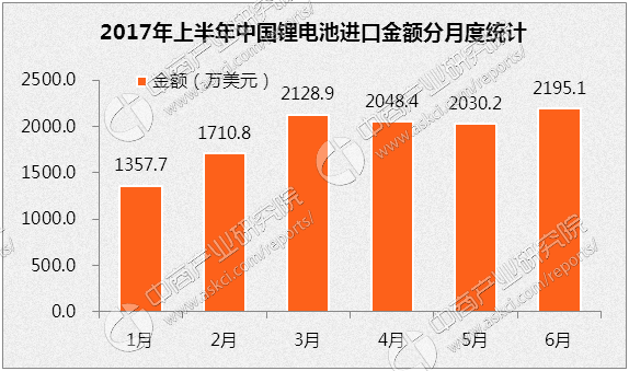 中國儲能網(wǎng)訊:中商產(chǎn)業(yè)研究院最新發(fā)布的《2017年中國鋰電池進口月度監(jiān)測報告》數(shù)據(jù)顯示:2017年上半年中國鋰電池進口總額為1.15億美元,同比增長19.7%,進口數(shù)量為4.06億個,同比增長9.0%。