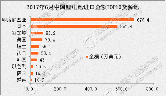 2017年6月中國鋰電池進口前十貨源地合計進口金額達1605萬美元,占出口總額的73.12%;其中從印度尼西亞進口達676.4萬美元,占出口總額的30.81%。
