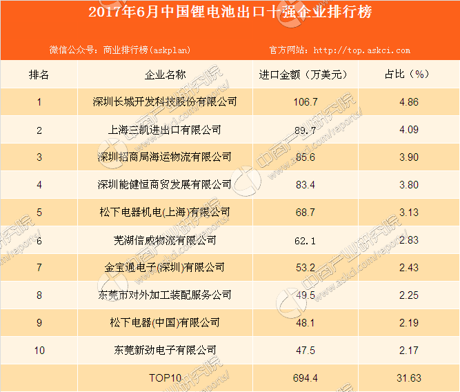 2017年6月中國鋰電池進口企業(yè)約為550家。其中,排在前十企業(yè)合計進口694.4萬美元,占出口總額的31.63%。2017年6月鋰電池進口前十企業(yè)如下: