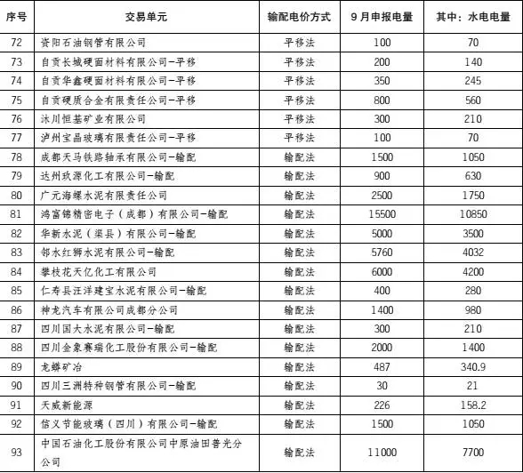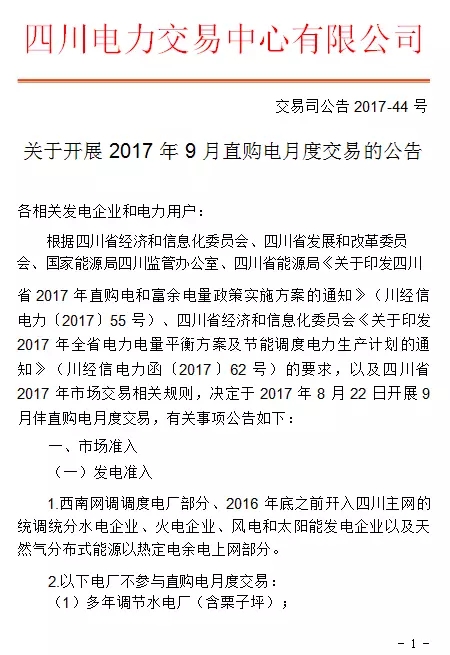 四川開展2017年9月直購電月度交易公告
