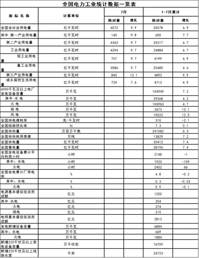 1-7月份全國電力工業(yè)統(tǒng)計(jì)數(shù)據(jù)發(fā)布。1-7月,全國全社會(huì)用電量35578億千瓦時(shí),增6.9%。全國售電量28196億千瓦時(shí),增7.4%。