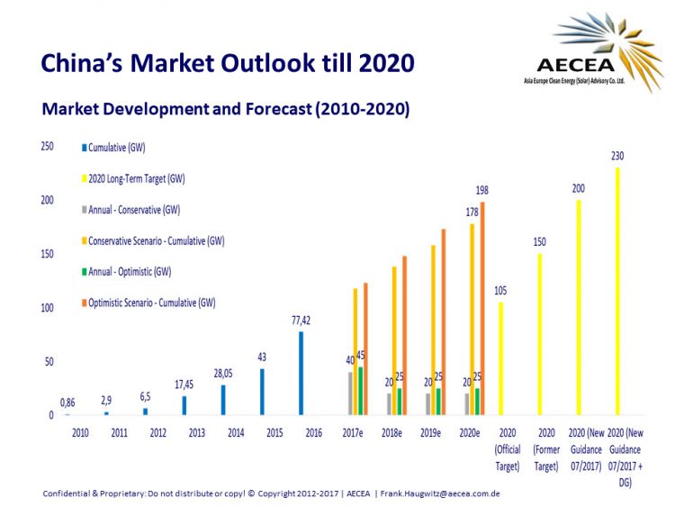 隨著7月份部署10.52吉瓦太陽(yáng)能,AECEA提高了其2017年的預(yù)測(cè),預(yù)計(jì)到年底,中國(guó)可能有望新增40-45吉瓦的太陽(yáng)能容量。這相當(dāng)于16%同比增長(zhǎng)率,并且有望超過(guò)2016年創(chuàng)紀(jì)錄部署容量30%。