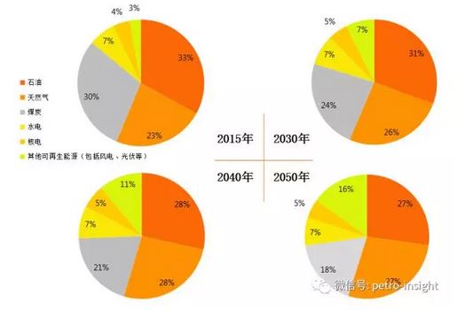 可再生能源占一次能源需求增量近一半。2050年,煤炭需求較2015年減少8.2億噸油當量,石油需求增加4.4億噸油當量,天然氣需求增加15.2億噸油當量,可再生能源需求增加22.5億噸油當量。