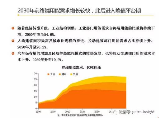展望期內(nèi),煤炭在終端部門的消費量將逐步下降,油品在2030年前有一定增長,天然氣需求增長將持續(xù)到2040年后,電力消費則持續(xù)上升。