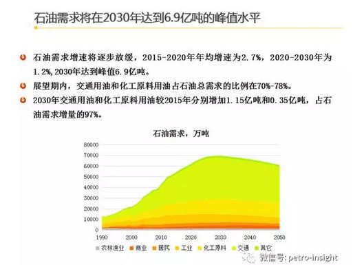 3.石油將在2030年達到峰值需求6.9億噸。交通用油也在2030年達到3.8億噸的峰值水平;其中,柴油需求逐步下滑,汽油需求在2025年前后達峰,航煤需求將保持增長。