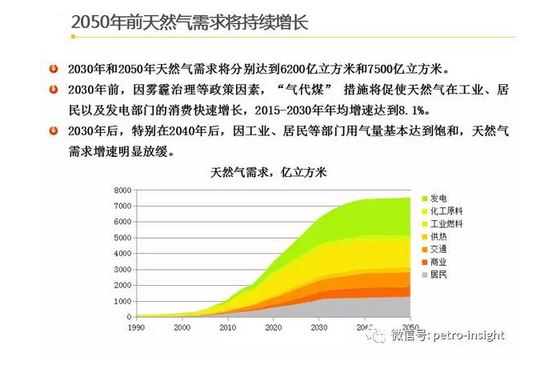 4.天然氣需求在展望期內(nèi)穩(wěn)步增長,且2040年前為高速增長期,需求增長主要在電力、工業(yè)和居民等部門。