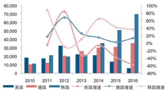 根據(jù)數(shù)據(jù),2016 年我國(guó)多晶硅進(jìn)口 14.1 萬(wàn)噸,同比增長(zhǎng) 25.67%,進(jìn)口規(guī)模占總消費(fèi)量的 40%以上。其中,從韓國(guó)進(jìn)口 7.01 萬(wàn)噸,同比增長(zhǎng) 36.92%;從德國(guó)進(jìn)口 3.57萬(wàn)噸,同比增長(zhǎng) 14.01%。從美國(guó)進(jìn)口 0.56 萬(wàn)噸,同比減少 56.76%。