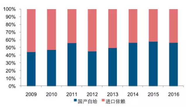 2016 年我國(guó)多晶硅進(jìn)口量占總消費(fèi)量的 40%以上