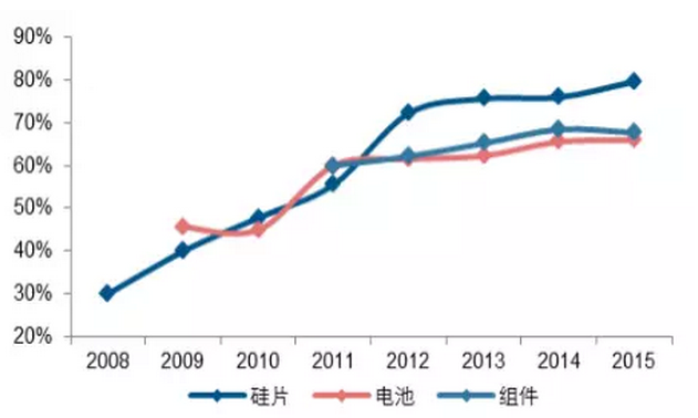 2015 年我國(guó)硅片、電池、組件環(huán)節(jié)產(chǎn)能均占全球 70%以上