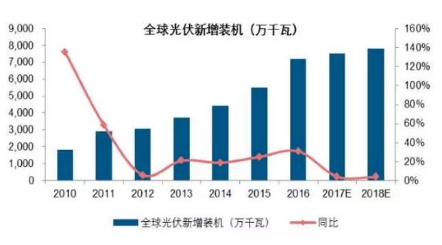 預(yù)計(jì)2017-2018 年全球光伏裝機(jī)將維持穩(wěn)態(tài)發(fā)展,年化增速在 5%左右