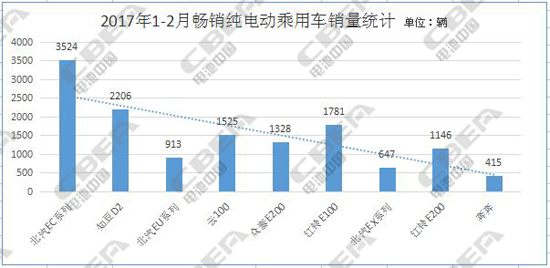 據(jù)不完全統(tǒng)計,2017年1-2月,我國純電動乘用車銷量排行前10位的品牌車型分別是北汽EC系列(3524輛)、知豆D2(2206輛)、江鈴E100(1781輛)、云100(1525輛)、眾泰E200(1328輛)、江鈴E200(1146輛)、眾泰TTEV(979輛)、北汽EU系列(913輛)、北汽EX系列(647輛)、奔奔(415輛)。