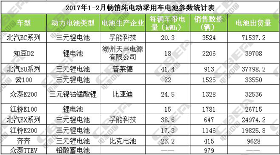 2017年前兩個月,這些在市面上比較暢銷的純電動乘用車品牌車型,其所配動力電池出貨量也大不相同。出貨量最高的是北汽EC系列,所配電池是三元鋰電池,由孚能科技生產(chǎn),每輛車電池的帶電量為20.3kWh,1-2月該系列車型所配電池出貨量為71537.2kWh。
