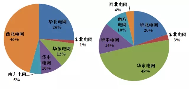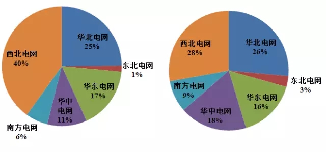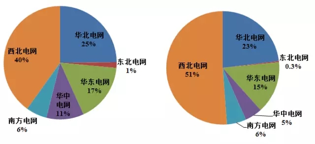 從上圖可以看出,西北電網(wǎng)累計(jì)裝機(jī)占比40%,而新增裝機(jī)占比僅占28%;華中電網(wǎng)累計(jì)裝機(jī)占比11%,而新增裝機(jī)占比則為16%;除此之外,南方電網(wǎng)、東北電網(wǎng)的新增裝機(jī)量也明顯高于累計(jì)裝機(jī)量。