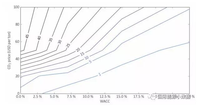 假設(shè)一個發(fā)達(dá)國家的WACC為3%,二氧化碳價格為60美元/噸;而一個發(fā)展中國家的WACC為10%,碳價為20美元/噸。在這種情況下對發(fā)電能源結(jié)構(gòu)進(jìn)行優(yōu)化,可再生能源(光伏和風(fēng)電)的最優(yōu)比例在發(fā)達(dá)國家可達(dá)37%,而在發(fā)展中國家僅為2%。這一結(jié)果并不令人意外:一個貧窮的發(fā)展中國家資金匱乏,需要盡可能的以較低的初投資來建設(shè)能源基礎(chǔ)設(shè)施,以便滿足更迫在眉睫的民生需求(住房、醫(yī)療、教育等)。所以,如果要讓發(fā)展中國家一步到位直接走上低碳發(fā)展的道路,發(fā)達(dá)國家的優(yōu)惠資金支持(降低發(fā)展中國家折現(xiàn)率)不可或缺。