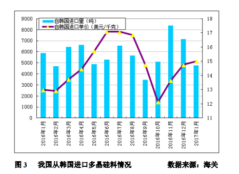 2017年1月份從韓國進口多晶硅量為4750噸,環(huán)比減少33.5%;月進口均價回升至15.0美元/千克,環(huán)比漲幅為1.6%。