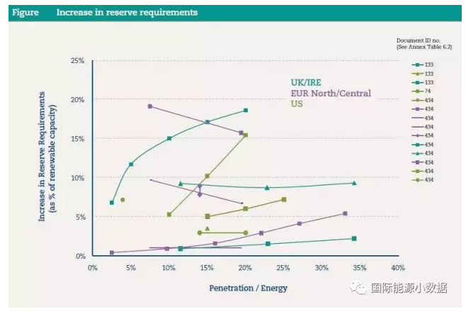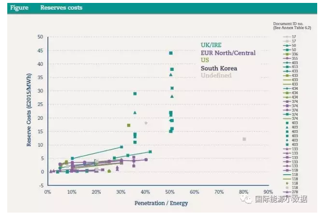 風電光伏的系統(tǒng)成本首先要考慮相應增加備用電源容量(reserve requirements)。如果風電光伏發(fā)電占到電力需求的30%情況下,因為備用電源要求增加的成本約為5英鎊/兆瓦時(合人民幣4.3分/千瓦時)。