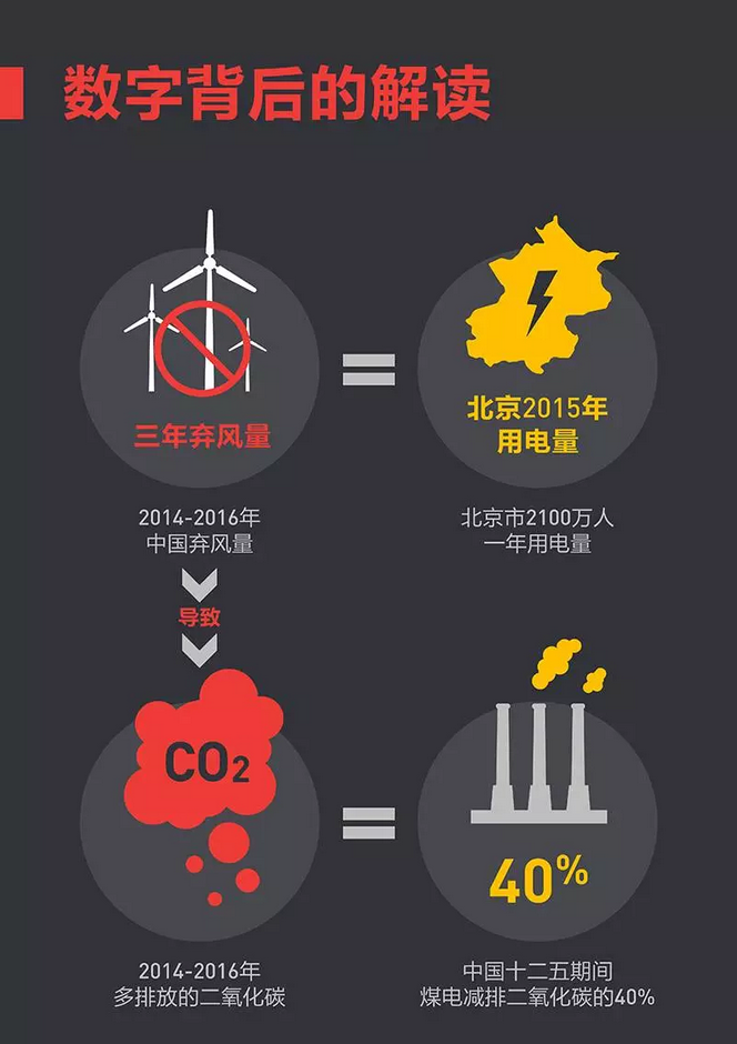 這組數(shù)字的比較,更讓我們對棄風(fēng)造成的損失感到震驚:2016年中國浪費(fèi)的風(fēng)電,就可以供一個(gè)大城市用一整年。棄掉清潔的風(fēng)電,不僅造成了風(fēng)電企業(yè)的經(jīng)濟(jì)損失,也大大削弱了其他領(lǐng)域節(jié)能減排、污染防治的效果。