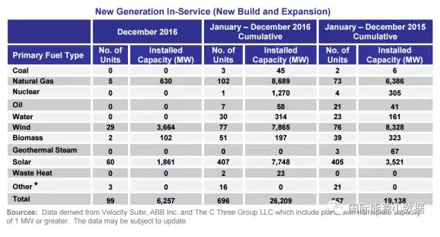 中國(guó)儲(chǔ)能網(wǎng)訊:根據(jù)美國(guó)聯(lián)邦能源監(jiān)管委員會(huì)(FERC)提供的數(shù)據(jù),2016年美國(guó)新增發(fā)電裝機(jī)容量26.209吉瓦,其中天然氣發(fā)電裝機(jī)8.689吉瓦、風(fēng)電7.865吉瓦、太陽(yáng)能7.748吉瓦,此外還有1臺(tái)核電機(jī)組(1.270吉瓦)投入運(yùn)行。