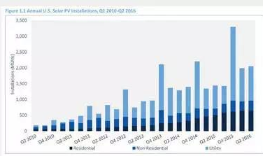 除了公共事業(yè)規(guī)模項(xiàng)目,2016年第二季度住宅和工商業(yè)板塊勢頭都很足。第二季度住宅裝機(jī)量同比增長29%,GTMResearch認(rèn)為雖然加利福尼亞州裝機(jī)小幅下滑,但猶他州和德克薩斯州的增長彌補(bǔ)了這點(diǎn)兒損失。