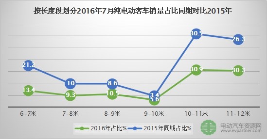記者整理發(fā)現(xiàn),按長(zhǎng)度劃分2016年7月純電動(dòng)客車(chē)銷(xiāo)量占比同期對(duì)比2015年變化不是很大,10-12米純電動(dòng)客車(chē)的銷(xiāo)量還是占多數(shù),9-10米純電動(dòng)客車(chē)銷(xiāo)量占比仍然是最少的。