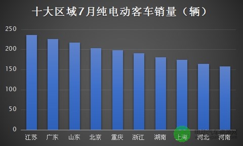 十大主流區(qū)域7月純電動(dòng)客車(chē)銷(xiāo)量均上百 江蘇最高