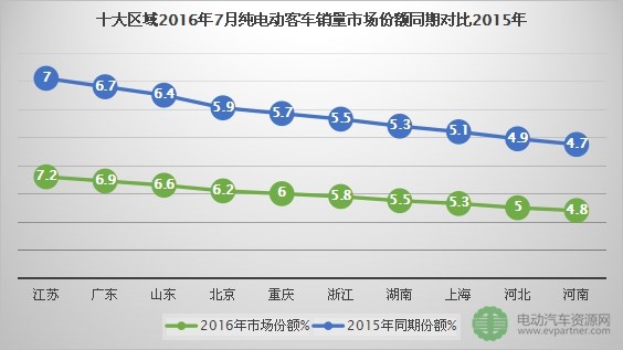 記者整理發(fā)現(xiàn),這十大主流區(qū)域2016年7月份純電動(dòng)客車(chē)市場(chǎng)份額一共占59.3%,同期對(duì)比2015年,2015年7月份這十大區(qū)域純電動(dòng)客車(chē)市場(chǎng)份額占57.2%。