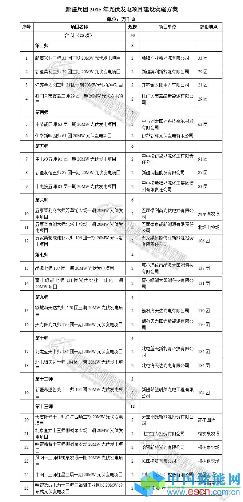 中國儲(chǔ)能網(wǎng)訊:在綜合考慮2014年項(xiàng)目建設(shè)情況、電力市場(chǎng)條件等因素的基礎(chǔ)上,2015年,新疆兵團(tuán)將50萬千瓦發(fā)電規(guī)模安排予25個(gè)光伏電站項(xiàng)目,具體名單見下表: