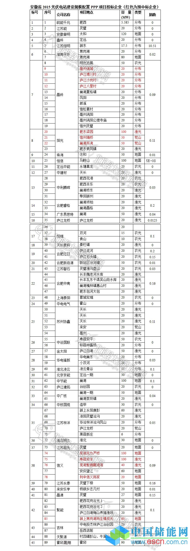 中國(guó)儲(chǔ)能網(wǎng)訊:2015年,安徽省共有89個(gè)備案光伏電站項(xiàng)目,其中配置ppp項(xiàng)目的投標(biāo)企業(yè)45家。具體名單見下表(ps.紅色字體標(biāo)注為預(yù)中標(biāo)企業(yè)):