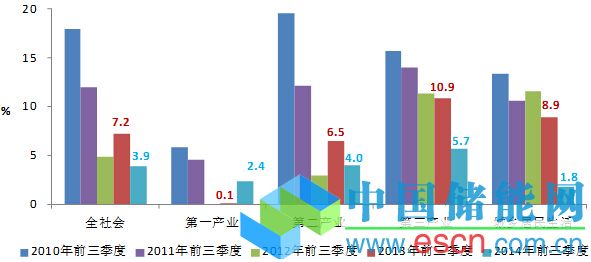 圖1 2010-2014年前三季度全社會及各產(chǎn)業(yè)用電量增長情況圖