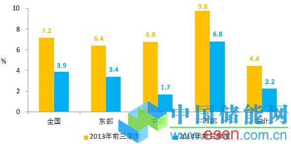圖2 2013、2014年前三季度各地區(qū)用電增速情況圖