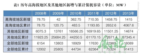 據(jù)中國(guó)可再生能源學(xué)會(huì)風(fēng)能專(zhuān)業(yè)委員會(huì)的數(shù)據(jù)顯示,中國(guó)從2008年開(kāi)始在高海拔地區(qū)有風(fēng)電裝機(jī),到2013年底累計(jì)裝機(jī)容量達(dá)到4067.6MW。在此6年間,高海拔地區(qū)新增裝機(jī)量總體呈現(xiàn)以上升為主,期間略有波動(dòng)的趨勢(shì)。其中,除2009年和2013年與前一年的新增裝機(jī)量相比略有下降外,2008年、2010年、2011年和2012年高海拔地區(qū)的新增裝機(jī)容量都比前一年有所上升。2013年,中國(guó)高海拔地區(qū)新增裝機(jī)容量為1415MW,占全部新增裝機(jī)容量的8.79%,相比2012年的1458.75MW及11.26%的占比,各數(shù)據(jù)均有所下降。與2012年相比,新增裝機(jī)容量在2013年下降的比較小,而占比卻下降的比較大,這從側(cè)面印證了2012年高海拔以外地區(qū)的新增裝機(jī)量曾出現(xiàn)較大的下降。雖然2012年以前新增裝機(jī)容量上升速度較快,但由于此前的裝機(jī)基數(shù)并不大,表現(xiàn)在累計(jì)裝機(jī)增長(zhǎng)上并不明顯,與之相反的是,2011年以后高海拔地區(qū)的新增裝機(jī)量達(dá)到了一定的量級(jí),雖然在2013年有所下降,但累計(jì)裝機(jī)上升的卻更為明顯。