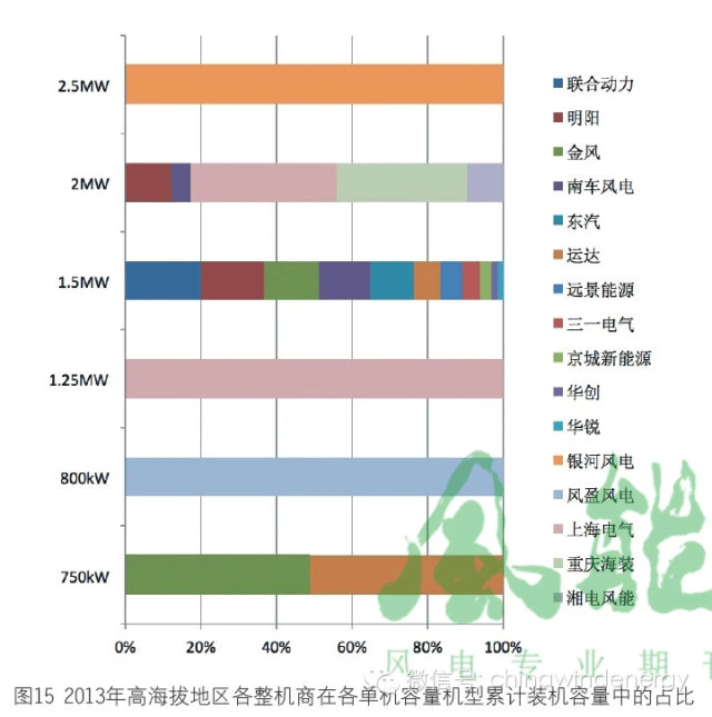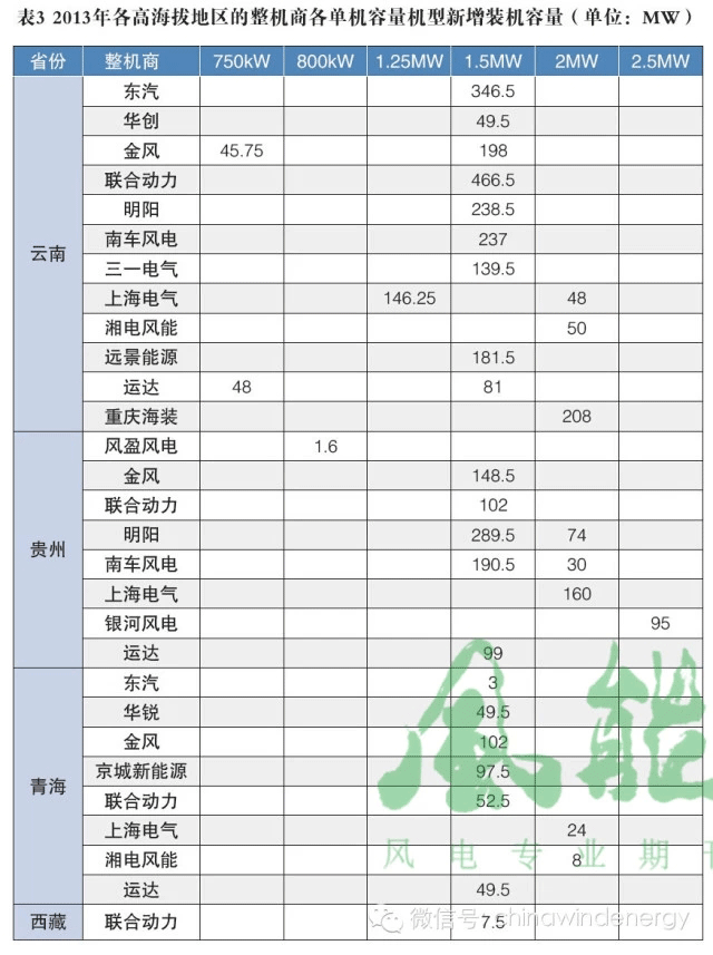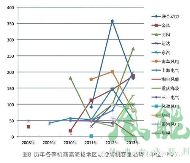 2008年金風(fēng)和運(yùn)達(dá)在云南分別安裝了各自生產(chǎn)的750kW型風(fēng)電機(jī)組,至2013年,在高海拔地區(qū)累計(jì)安裝風(fēng)電機(jī)組最多的整機(jī)商是聯(lián)合動(dòng)力,其次是明陽(yáng),以及金風(fēng)、南車(chē)、上海電氣。這些整機(jī)商在高海拔地區(qū)的風(fēng)電機(jī)組累計(jì)裝機(jī)容量分別為628.5MW、602MW、494.25MW、457.5MW和378.25MW。