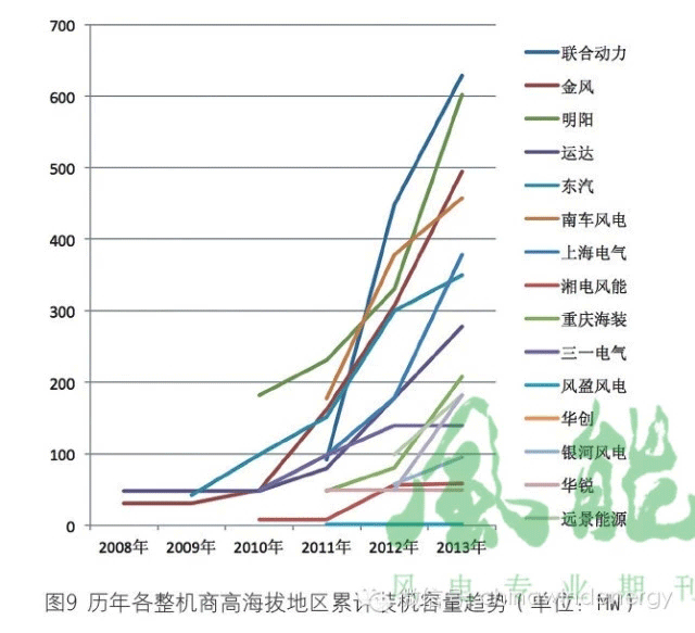 在高海拔地區(qū)的新增裝機(jī)容量方面,2013年明陽(yáng)的該項(xiàng)數(shù)據(jù)最為惹眼,為272MW。第二位的上海電氣為200MW。第三位的金風(fēng)為187.5MW,第四位的聯(lián)合動(dòng)力為180MW,第五位的重慶海裝為128MW。其中聯(lián)合動(dòng)力是2012年在高海拔地區(qū)新增裝機(jī)最高的整機(jī)商,達(dá)到了357MW,這也是截至2013年底單個(gè)整機(jī)商在高海拔地區(qū)一年時(shí)間內(nèi)的最大裝機(jī)量。由圖8可以看出,各整機(jī)商在高海拔地區(qū)歷年的新增裝機(jī)量變化較大,使名次變化也較為頻繁,說(shuō)明在高海拔地區(qū)的風(fēng)電裝機(jī)本身量不是太大,從而受項(xiàng)目影響比較大。