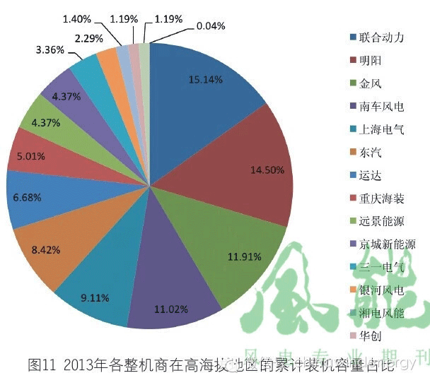 由圖11可以看出,2013年高海拔地區(qū)累計(jì)裝機(jī)容量占比最高的是聯(lián)合動(dòng)力,達(dá)到了15.14%。占比第二高的是明陽(yáng),為14.5%。占比第三、四、五高的分別是金風(fēng)、南車(chē)風(fēng)電和上海電氣,分別為11.91%、11.02%和9.11%。這項(xiàng)數(shù)據(jù)中累計(jì)裝機(jī)前五名的整機(jī)商占比達(dá)到了全部高海拔地區(qū)累計(jì)裝機(jī)容量的61.68%。