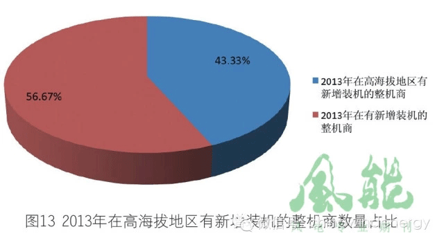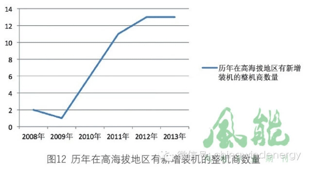 歷年在高海拔地區(qū)有新增裝機(jī)的整機(jī)商數(shù)量,除2009年比2008年少了1家外,整體上處于不斷增加的趨勢(shì)。整機(jī)商數(shù)量最高時(shí)的2012年和2013年均為13家。2013年在高海拔地區(qū)有裝機(jī)的整機(jī)商數(shù)量是當(dāng)年在中國(guó)有風(fēng)電裝機(jī)的整機(jī)商數(shù)量的43.33%。