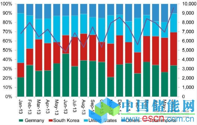 中國儲能網(wǎng)訊:2014上半年中國進(jìn)口多晶硅4.6萬噸,較去年同期增加17.4%。其中84%來自三個出口國:美國(21.8%),韓國(30.0%),德國(32.6%)。盡管中國在今年1月公布了對從美國和韓國進(jìn)口的多晶硅將征收懲罰性關(guān)稅,但實際情況中幾乎所有這兩國出口到中國的多晶硅都通過加工貿(mào)易(來料加工或進(jìn)料加工)的渠道避免了關(guān)稅。
