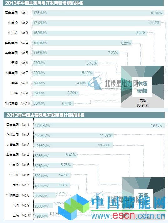 2013 年,風(fēng)電新增裝機(jī)排名中,國(guó)電集團(tuán)繼續(xù)保持其領(lǐng)先地位,中電投、中廣核緊隨其后,在風(fēng)電累計(jì)裝機(jī)中,僅國(guó)電集團(tuán)累計(jì)裝機(jī)容量超過(guò)15000MW,達(dá)到17508MW,占全國(guó)累計(jì)裝機(jī)總量的19.2%,其次分別為華能和大唐集團(tuán),裝機(jī)容量軍突破10000MW,所占市場(chǎng)份額分別為11.7%和11.6%。前十名風(fēng)電開(kāi)發(fā)商的市場(chǎng)份額進(jìn)一步提升,三峽和天潤(rùn)近幾年新增裝機(jī)增速較快,替代京能和新天綠色能源進(jìn)入前10名。