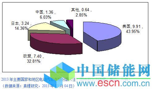 中國儲能網(wǎng)訊:真鋰研究的監(jiān)測數(shù)據(jù)顯示,2013年全球電動汽車銷量共計22.55萬輛左右,較2012年的12.96萬輛增長了73.95%。全球的電動汽車市場基本上集中在美國、歐盟、日本和中國,份額分別為43.95%、32.81%、14.36%和6.03%;其他國家和地區(qū)很少,合計市場份額不到3%。