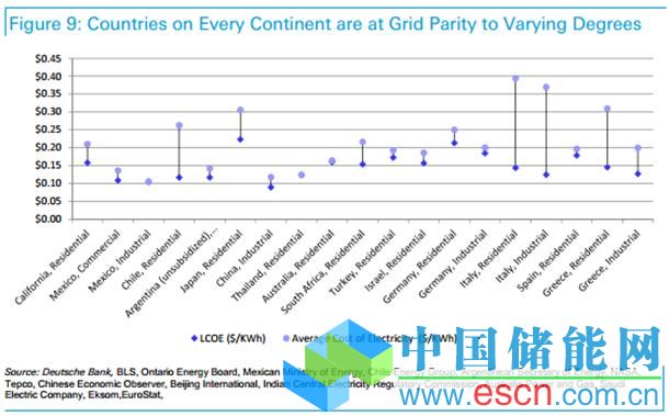 德意志銀行計(jì)算19個(gè)不同電力市場,包括美國加州住宅用電、墨西哥的商業(yè)與工業(yè)用電、智利住宅用電、阿根廷住宅用電、日本住宅用電、中國工業(yè)用電、泰國住宅用電、澳洲住宅用電、南非住宅用電、土耳其住宅用電、以色列住宅用電、德國住宅與工業(yè)用電、義大利住宅與工業(yè)用電、西班牙住宅用電,以及希臘的住宅與工業(yè)用電。其太陽能電池發(fā)電的每度電均化成本(LevelizedCostofElectricity,LCOE),均已經(jīng)低于市場的平均電價(jià),也就是說,安裝太陽能電池發(fā)電將可省錢。
