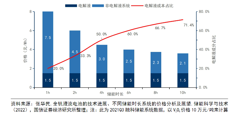 從經(jīng)濟(jì)性上看,全釩液流電池儲(chǔ)能的初始投資成本在2.5元-7.5元/Wh,時(shí)長(zhǎng)越大,單瓦時(shí)的投建成本越低,8小時(shí)以上可以降到2元/Wh左右,接近鋰電儲(chǔ)能。而且,全釩液流電池的壽命長(zhǎng)達(dá)20年,是鋰電池的2倍,這進(jìn)一步攤低了初始投資的單位成本,成本更優(yōu)于鋰電儲(chǔ)能系統(tǒng)。即便是20年壽命到期,釩液流電池電解液的殘值和循環(huán)利用價(jià)值也高達(dá)30%以上,全生命周期成本更低。未來,隨著更多全釩液流電池儲(chǔ)能項(xiàng)目的上馬,很容易在市場(chǎng)層面引發(fā)共鳴。