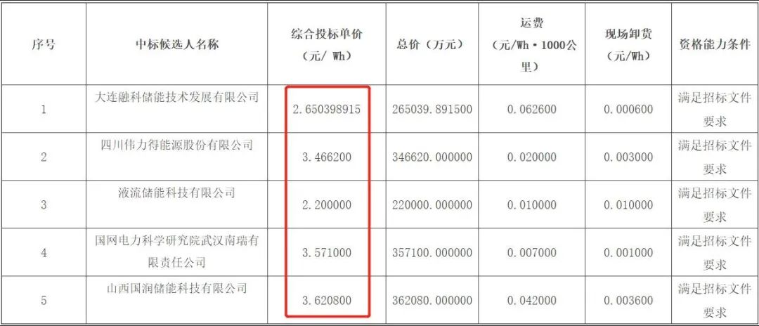 最終,該項(xiàng)目有5家企業(yè)中標(biāo),且價(jià)格差額較大。最高中標(biāo)價(jià)的3.62元/Wh和最低中標(biāo)價(jià)的2.2元/Wh差額達(dá)1.42元,這樣的價(jià)格差也反應(yīng)了釩電池企業(yè)在技術(shù)水平、成本控制、市場(chǎng)策略等方面的較大差異。