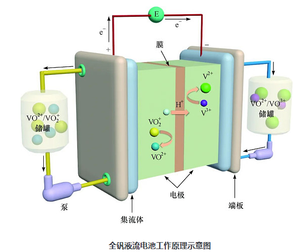 液流電池是一種新型蓄電池,是一種利用某些元素(通常是金屬)氧化狀態(tài)下的能量差異來(lái)儲(chǔ)存或釋放能量的電化學(xué)轉(zhuǎn)換裝置。不同類(lèi)別的液流電池具有不同的化學(xué)成分,包括最常用的釩以及不常用的鋅-溴、多硫化物-溴、鐵-鉻和鐵-鐵。