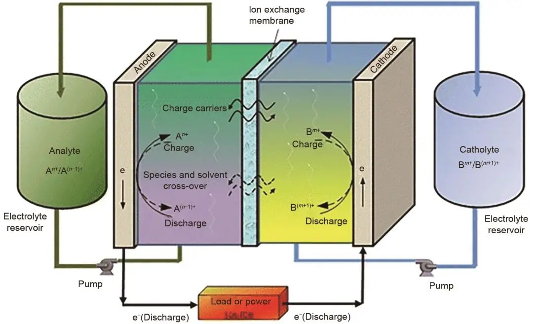 液流電池主要利用正負(fù)極兩側(cè)溶液中活性物質(zhì)氧化還原狀態(tài)的改變來(lái)實(shí)現(xiàn)充放電。如下圖所示,液流電池主要由電堆和兩個(gè)電解液儲(chǔ)罐構(gòu)成。電解液儲(chǔ)存在電堆外部的儲(chǔ)液罐中,通過(guò)泵輸送至電堆內(nèi)部,在電極處進(jìn)行氧化還原反應(yīng),反應(yīng)后的活性物質(zhì)隨著電解液流回外部?jī)?chǔ)罐。在陽(yáng)極和陰極之間是隔膜,可選擇性地允許支持電解質(zhì)透過(guò)以保持電解質(zhì)平衡。