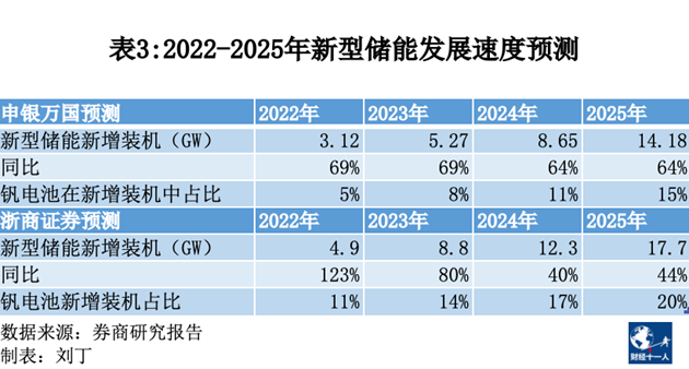 申銀萬(wàn)國(guó)據(jù)此預(yù)測(cè):2022年到2025年,中國(guó)新型儲(chǔ)能年新增裝機(jī)量的同比增速將分別達(dá)到69%、69%、64%、64%;浙商證券認(rèn)為同比增速可達(dá)到123%、80%、40%、44%。2025年中國(guó)新型儲(chǔ)能年裝機(jī)量中,釩電池儲(chǔ)能的占比可達(dá)到15%到20%。